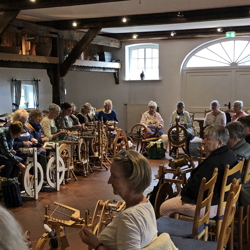 15.09.2023 - Man hat schon gehört, dass Rumpelstilzchen Stroh zu Gold spinnen konnte. Dies ist am heutigen Sonntag zwar nicht passiert, aber über 30 Teilnehmer, beim großen Anspinnen in unserem Hof Kleiberg, hatten viel Spaß an ihrem Hobby, das Spinnen, und konnten sich unter den verschiedenen Vereinen wunderbar beim Spinnen, einer Tasse Tee und einem leckeren Stück Kuchen austauschen. Schon interessant, wie unterschiedlich Spinnräder ausschauen können, mal klassisch, mal hochmodern. Ob jung oder alt, ob Mann oder Frau, heute traf man alles im Hof beim gemeinsamen Anspinnen auf der Hofdiele an. Für musikalische Stimmung sorgte unser Männersingkreis mit fröhlichen, plattdeutschen Liedern. Vielen Dank gilt wieder all den freiwilligen Helfern, ohne die solch‘ eine Veranstaltung nicht funktionieren kann. Und schön, dass sich so viele Vereine von Halsbek, Neuenburg, Rastede, Bad Zwischenahn, Oldenburg, Esens und Rhauderfehn auf den Weg gemacht haben, um an der Veranstaltung teilzunehmen.